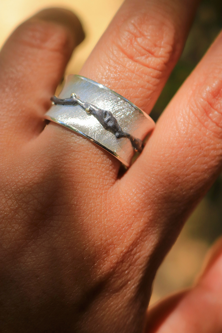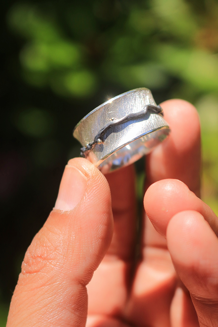 Anillo de plata con cinta giratoria de plata refundida y envejecida y bolitas de oro amarillo