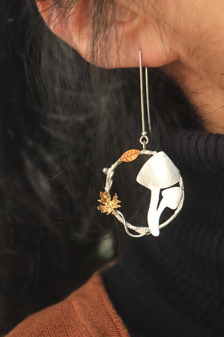 Aros de Plata en técnica refundida con figuras del reino Fungi y Hojas labradas a mano en Plata, Cobre y Bronce.