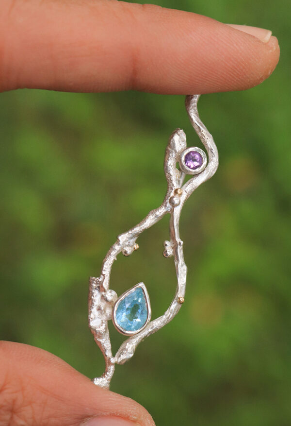 Colgante de Plata hecho a mano en técnica refundida con una gota de Aguamarina facetada, Amatista y aplicaciones de Oro Amarillo